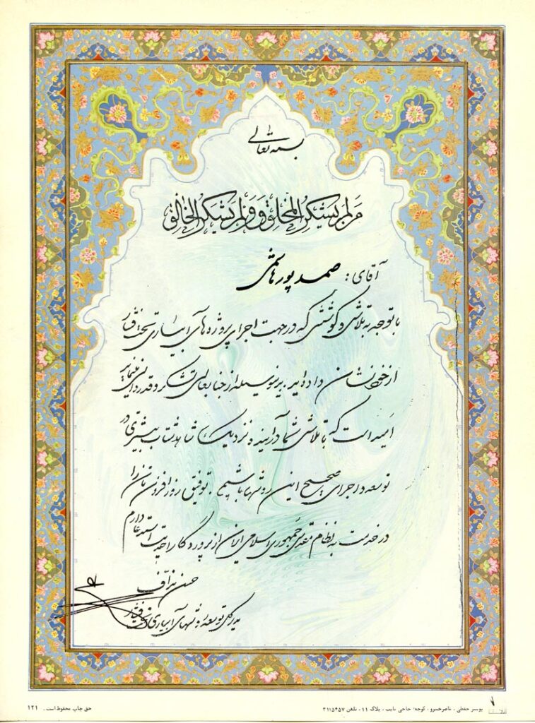 جناب مهندس صمد پورهاشمی مدیر عامل و رئیس هیت مدیره شرکت مهندسی آب پیمان در بخش های مختلف آبیاری تحت فشار فعالیت داشته و توانسته پیشرفت قابل ملاحظه ای برای خود و این شرکت به ارمغان آورد که از مهمترین این فعالیت ها میتوان به موارد زیر اشاره نمود: